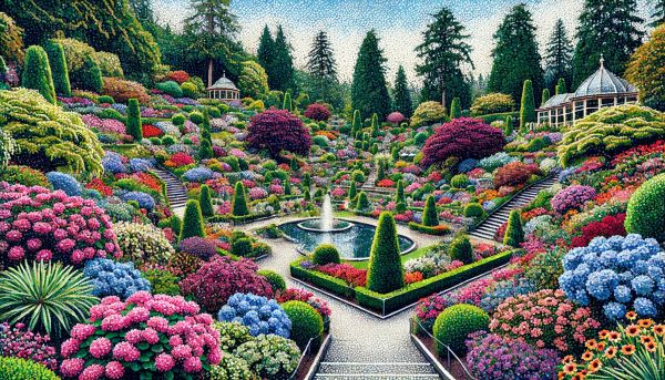 Bathed in the lush hues of nature, the Butchart Gardens unfold as a dazzling spectacle of botanical artistry. Nestled in Brentwood Bay, Victoria, BC, this garden sanctuary offers a vivid tableau of floral arrangements, tailored pathways, and serene water features. Each year, visitors are greeted by the vibrant splashes of seasonal blooms that line the intricately designed walkways, with springtime tulips, summertime roses, and autumnal chrysanthemums painting a living mosaic. Grand fountains and ornate gazebos punctuate the landscape, inviting moments of reflection amidst the garden's tranquil beauty. Incorporating a mix of native and exotic plants, the gardens also serve as a vibrant habitat for a diverse array of wildlife, providing endless photographic opportunities and a perfect backdrop for anyone seeking a peaceful escape from the bustling world outside. *** About Butchart Gardens: Butchart Gardens, originally the site of a limestone quarry, was transformed into a stunning botanical garden by Jennie Butchart in the early 1900s. Over the years, it has evolved into one of Canada's most famous tourist attractions, drawing over a million visitors annually. The garden spans approximately 55 acres and features several distinct areas including the Sunken Garden, the Japanese Garden, the Italian Garden, and the Mediterranean Garden. Each section is meticulously maintained and designed to showcase different landscaping styles and plant varieties, offering a year-round spectacle that changes with the seasons.