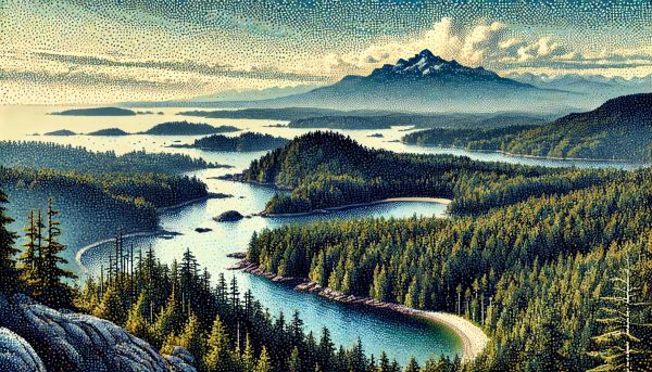Bathed in the soft glow of the afternoon sun, the lush landscapes of Vancouver Island unfold majestically in this artwork. Distinguished by its vibrant rendition of the dense forests, tranquil blue waters, and distant mountains, this piece brilliantly adopts the Impressionist style to evoke a sense of peace and awe. The detailed stippling technique used in the depiction of trees and surfaces adds texture and movement, inviting the viewer to explore every corner of the canvas. The high vantage point offers a sweeping view over a serpentine coastline and a series of small islands scattered across the calm sea, under a sky lightly brushed with clouds. This artwork is not only a tribute to the natural beauty of British Columbia but also a testament to the enduring appeal of landscape art in capturing imaginations. Splashes of green, blue, and earth tones harmonize to create a balanced and calming scene, ideal for anyone seeking to bring the essence of outdoor tranquility into their living space.