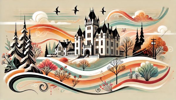 Enveloped by the whimsical charm of autumn, winter, and a hint of spring, Craigdarroch Castle stands majestically amid swirling colors and flowing lines. This minimalist brush calligraphy artwork captures the essence of the historic castle with a modern artistic twist, presenting it as a focal point amidst vibrant, stylized flora and sleek, undulating landscapes. The illustration's palette ranges from warm golds and deep reds of autumn leaves to the cool whites and blues depicting winter's touch, with sprightly greens heralding the onset of spring. Overhead, silhouetted birds traverse the scene, adding a dynamic sense of movement that complements the static, towering structure of the castle. This visual feast not only pulls the viewer into a layered, textured world but also bridges the gap between traditional subject matter and contemporary art expression, perfect for adorning any space that values a blend of history and modernity. *** About Craigdarroch Castle: Completed in the late 19th century, Craigdarroch Castle is an emblem of Victoria, BC's rich history. This Victorian-era mansion, known for its impressive woodwork and beautiful stained glass, serves as a museum and historic site. Built by the wealthy coal baron Robert Dunsmuir during the reign of Queen Victoria, it expresses the luxurious lifestyle of the era, standing four floors tall with 39 rooms and over 20,000 square feet of space. Beyond its architectural beauty, the castle embodies the complex social history of its time, providing visitors with a glimpse into the privileged lives of the Dunsmuir family.
