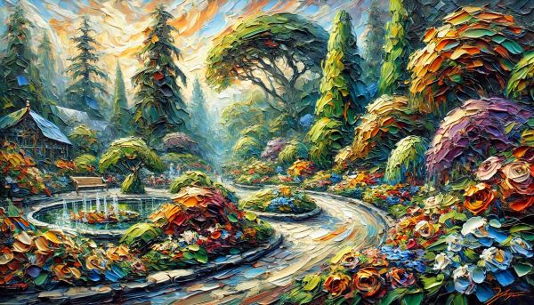Title: Vibrant Impasto Oil Painting of Butchart Gardens at Dawn Photo ID: 62815
