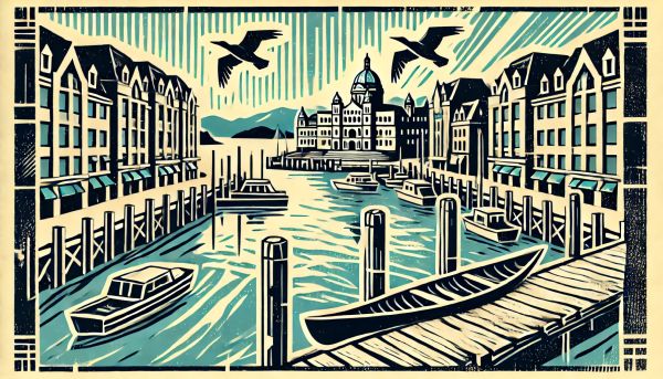 Title: Vibrant Victoria Inner Harbour: A Constructivism Woodblock View