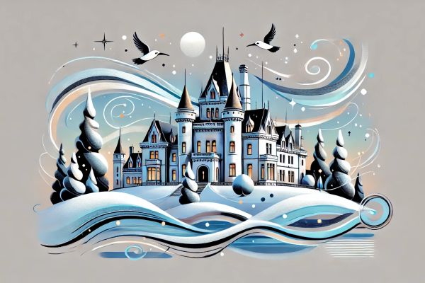 Title: Enchanting Nighttime View of Snow-Covered Hatley Castle Art Print Photo ID: 63497